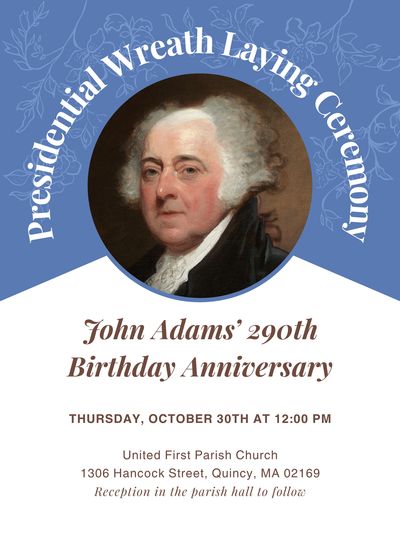 Join us on Thursday, October 30th at 12:00 noon for our annual Presidential Wreath Laying Ceremony in honor of President John Adams’ 290th birthday.