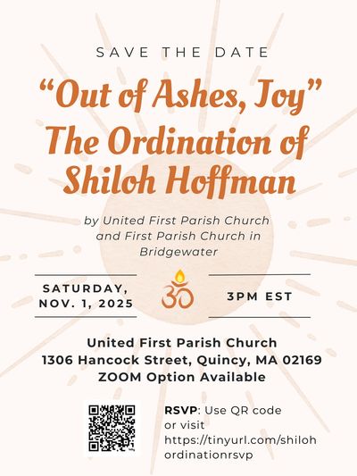 All are welcome to attend the ordination of Shiloh Hoffman, former Ministerial Intern here at United First Parish Church. We will join First Parish Unitarian Universalist Church of Bridgewater in ordaining Shiloh to Unitarian Universalist ministry.